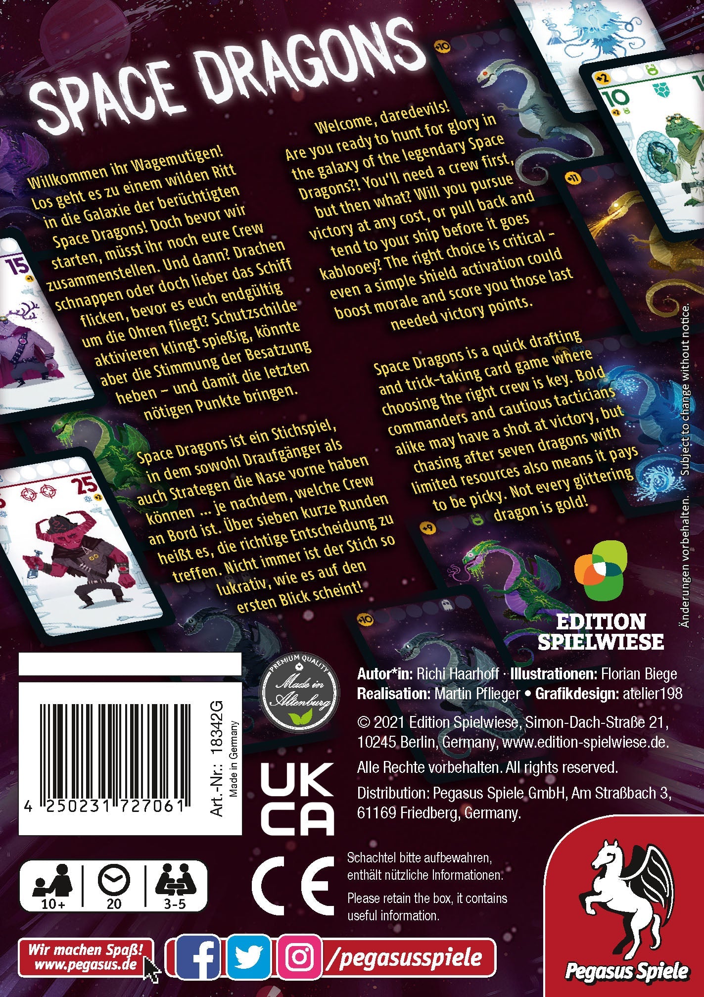 Im Stichspiel Space Dragons draften die Spielenden zunächst eine Crew aus neun Handkarten, dann versuchen sie sieben davon geschickt so auszuspielen, dass sie möglichst viele Punkte erzielen. Wer die höchste Karte einer Runde ausspielt, gewinnt den offen ausliegenden Drachen. Im Gegensatz zu anderen Stichspielen gibt es jedoch keinen Farbzwang und die ausgespielten Karten bleiben vor den jeweiligen Mitspielenden liegen. Sie bringen besondere Effekte beim Ausspielen, aber auch Siegpunkte. Mit drei doppelseitigen Wertungskarten und einer Variante für ein noch schnelleres Spiel ist für viel Abwechslung gesorgt.