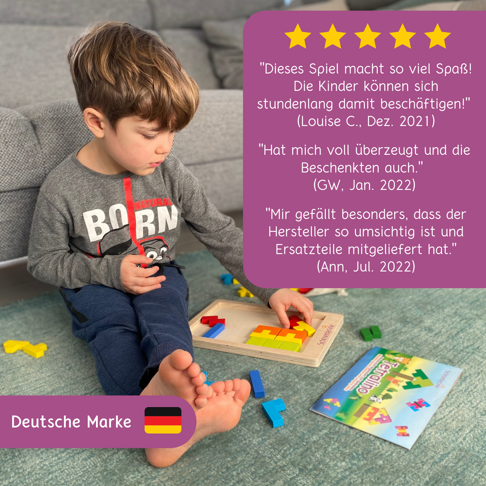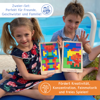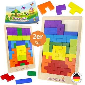 🌲 NATÜRLICH LERNEN: Dieses doppelte Puzzle-Set beinhaltet 88 Puzzleteile aus Vollholz, 2 Spielbretter, 1 Baumwollbeutel, 1 Spielanleitung - natürliches, hochwertiges Material für ein tolles Spielerlebnis! * 💡 KREATIV SEIN: Unendlich viele Kreationen sind mit diesen Puzzleteilen möglich, die in allen Richtungen zusammen passen, sei es 2D oder 3D, in eigenen Kreationen oder inspiriert durch die Spielideen und Formen im Begleitheft. * 🧠 LOGISCH FIT: Spielerisch wird die Logik, das Kombinieren von Formen und das räumliche Vorstellungsvermögen geschult - und dabei haben meist nicht nur kleine Logiker Spaß! Aufgrund der Tetris-Logik eignet sich das Tetralino aber bestens für Kinder ab 5 Jahren.