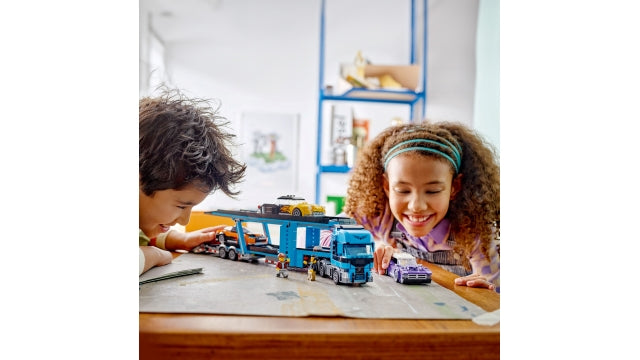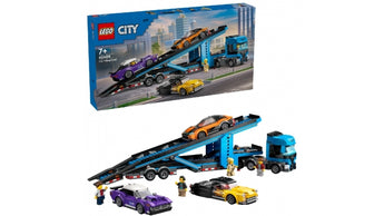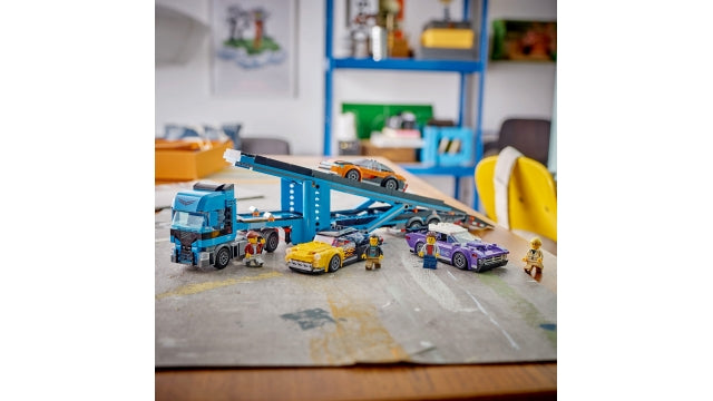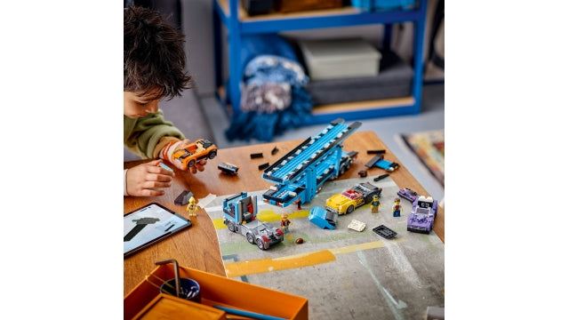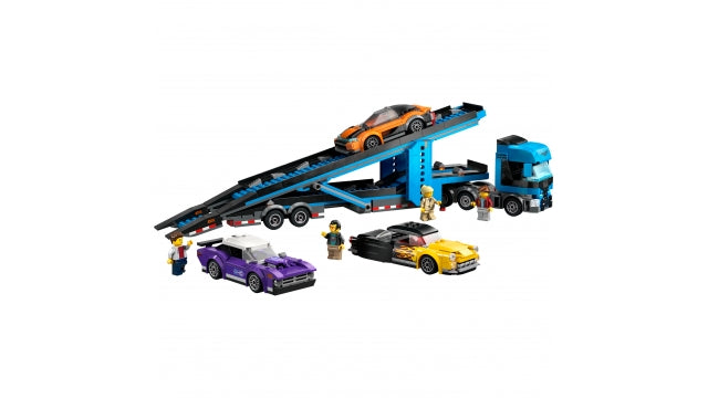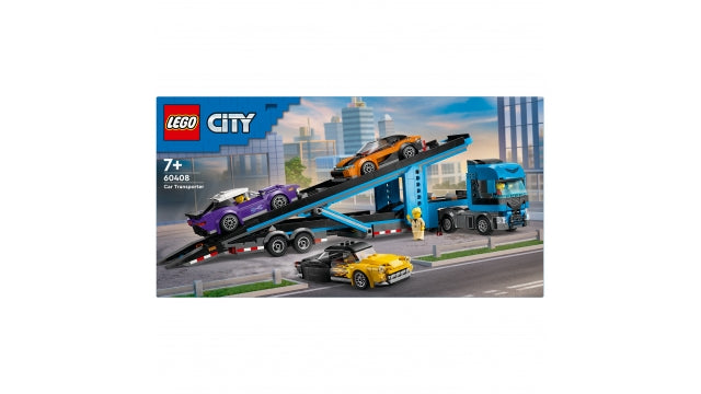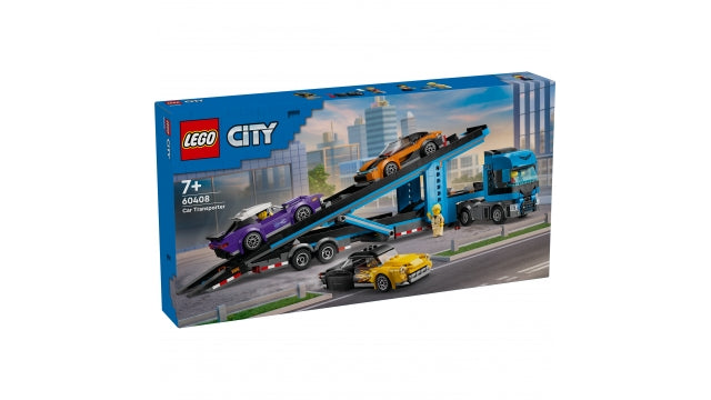 Machen Sie einem Spielzeugauto-Fan mit diesem LEGO City Transporter- und Sportwagen-Set (60408) eine Freude. Kinder können das Fahrerhaus kippen, um an den Motor zu gelangen, den Anhänger ankuppeln und die Rampen an Ober- und Unterdeck absenken. Es gibt einen Spornradwagen im Stil der 1950er, ein Muscle-Car aus den 1970ern und einen modernen Elektro-Supersportwagen. Dieses beeindruckende Spielset enthält 4 Minifiguren, die fantasievolles Spielen anregen. Zu diesem Autotransporter gibt es eine gedruckte Schritt-für-Schritt-Bauanleitung sowie eine 3-D-Bauanleitung in der LEGO Builder App – einem digitalen Baubegleiter mit intuitiven Zoom- und Drehfunktionen, mit denen Kinder die Modelle beim Bauen von allen Seiten betrachten können. LEGO City Sets sind tolle Geschenke für Kinder und enthalten coole Fahrzeuge, realistische Gebäude und lustige Charaktere. Kinder können dieses Set mit anderen (separat erhältlichen) Sets aus der LEGO City Reihe kombinieren, um noch mehr Spielspaß zu erleben. 998 Teile. Geeignet für Kinder ab 7 Jahren.
